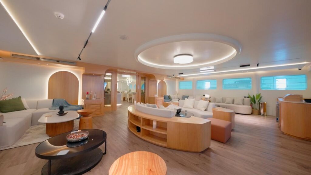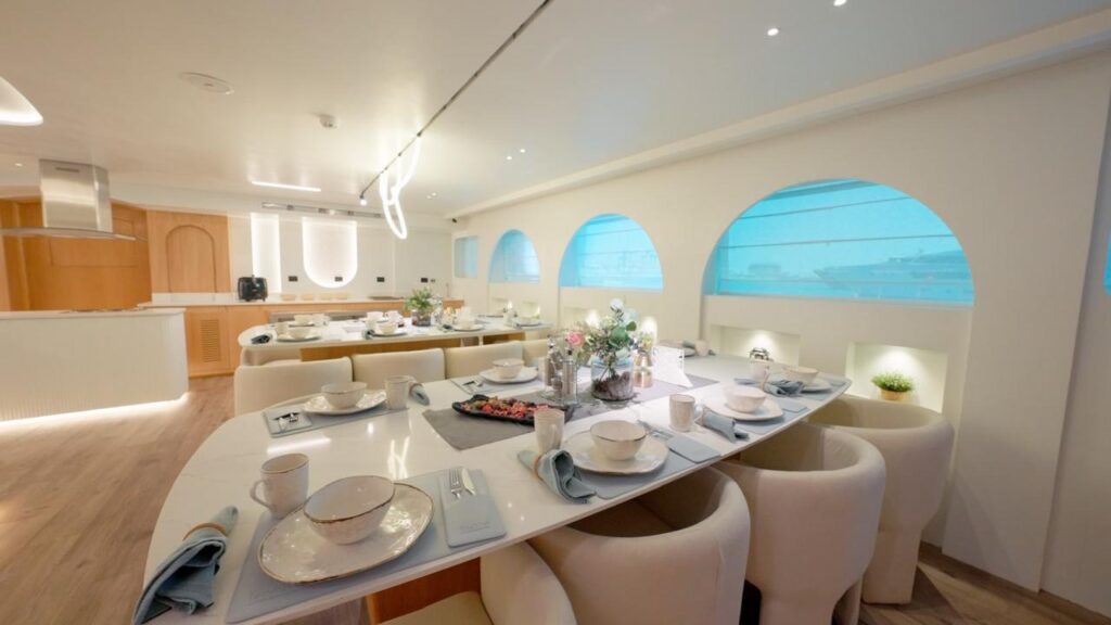On the way back, indulge in a selection of optional experiences onboard from meditation and yoga to water activities or simply unwind in the lounge, soak up the sun on the solarium, and refresh in the plunge pool.